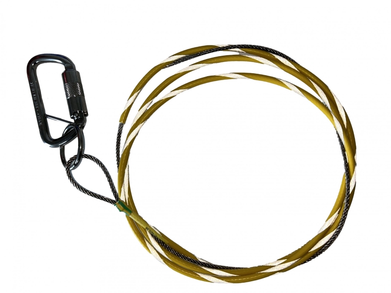 The Anti-Static Line ASL2650-C is a discharge cable intended for use in helicopter hoist operations. ASL2650-C is equipped with a utility ring in the upper end which enables connection of, for example guide line/trail line when used together. The Utility ring has a breaking strength of 2000kg. All anti-static lines from Helisafe has a built-in weak-link in the upper end of the cable which breaks at 110kg ± 20%. The upper wire loop is protected to avoid accidental connection of human cargo. The connector to the hoist hook is a stainless steel EN362 twist lock carabiner with captive pin that fits the utility eye on the most hoist hooks on the market. The stainless steel cable is pvc coated in yellow color with reflective stripe to make it highly visible during day and night operations and has a slim soldered lower end that minimize the risk of get caught.